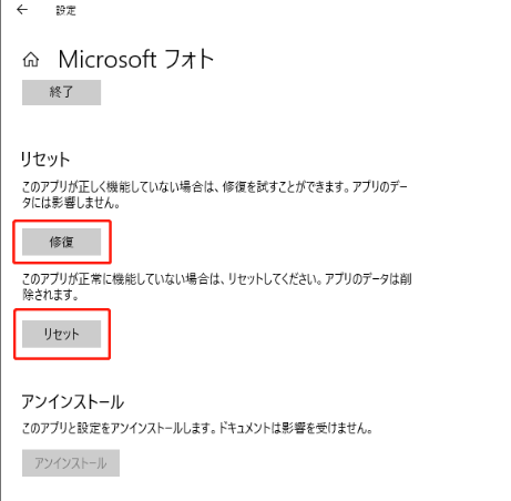 また、クイック修復に失敗した場合は、「高度な修復」を試みる。